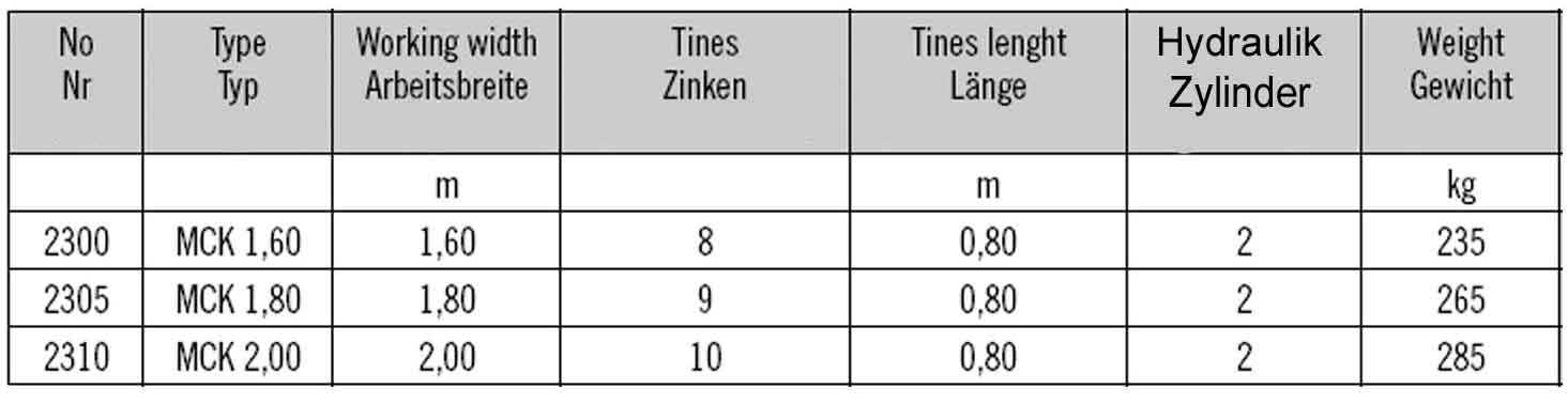 In den Arbeitsbreiten 1,5 m; 1,8 m; 2,0 m und 2,2 m andere Größen auf Anfrage